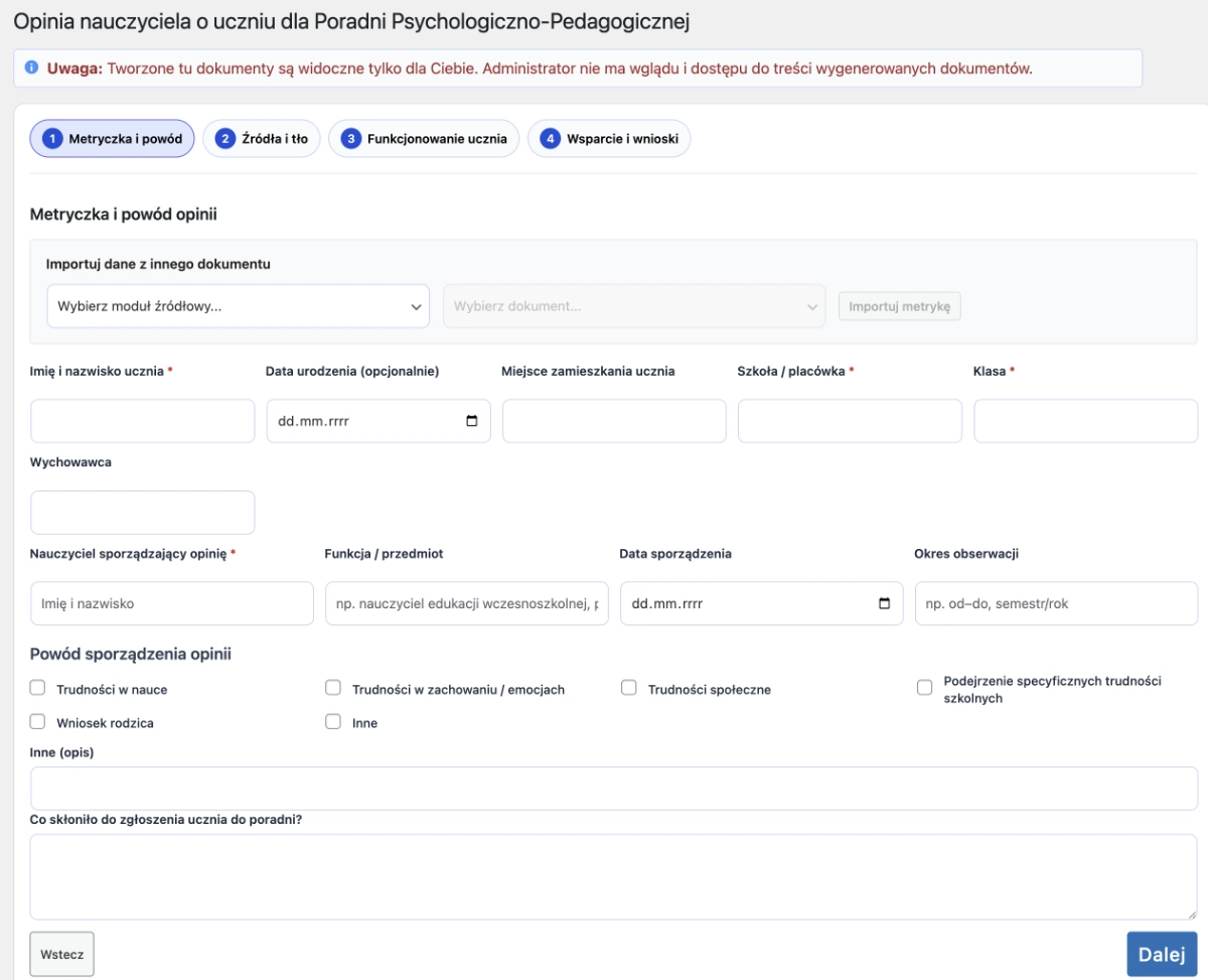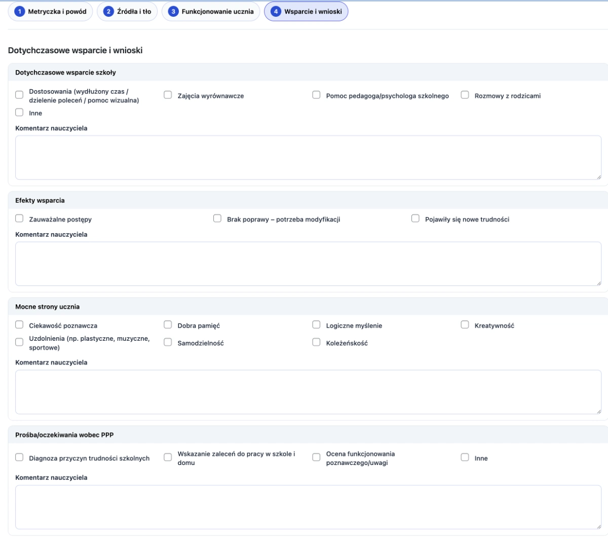 • powód zgłoszenia do poradni (np. trudności w nauce, zachowaniu, wniosek rodzica).