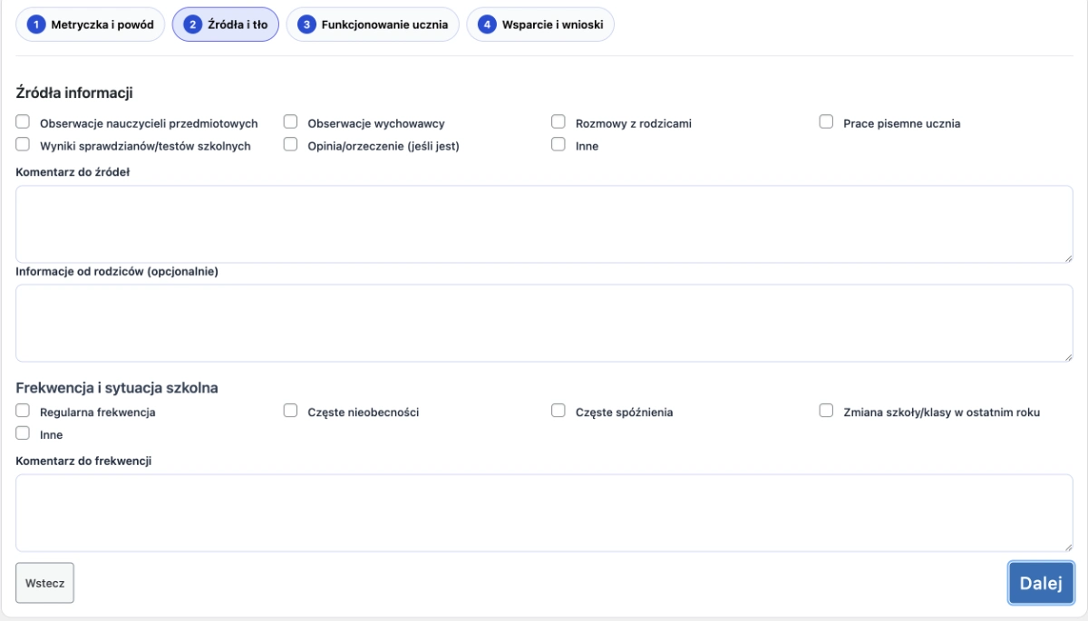 • oczekiwania wobec poradni – np. diagnoza, zalecenia, ocena funkcjonowania poznawczego.