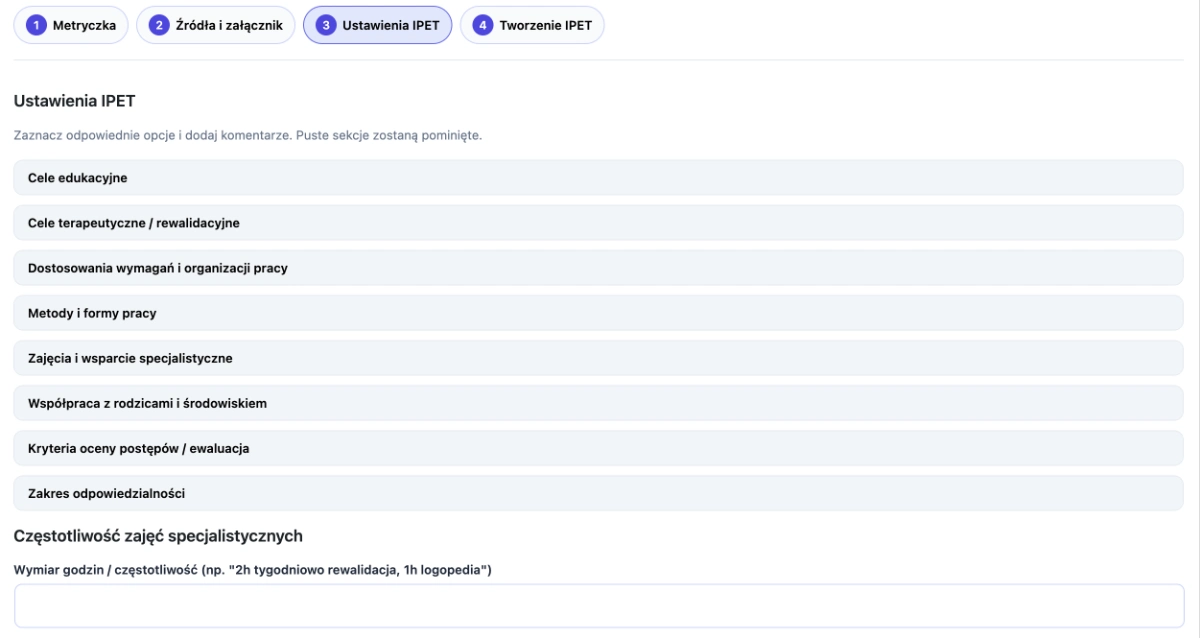 Cały dokument tworzony jest w logicznych etapach, a sekcje bez zaznaczonych danych automatycznie nie pojawiają się w finalnym PDF-ie.