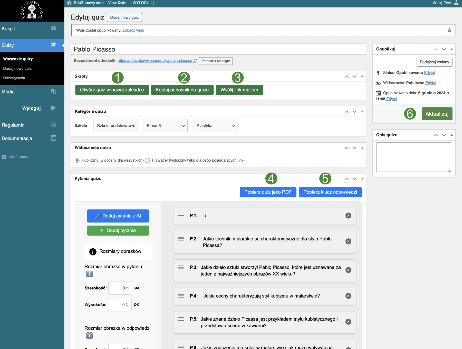 Po opublikowaniu quizu pojawiają się nowe funkcje: